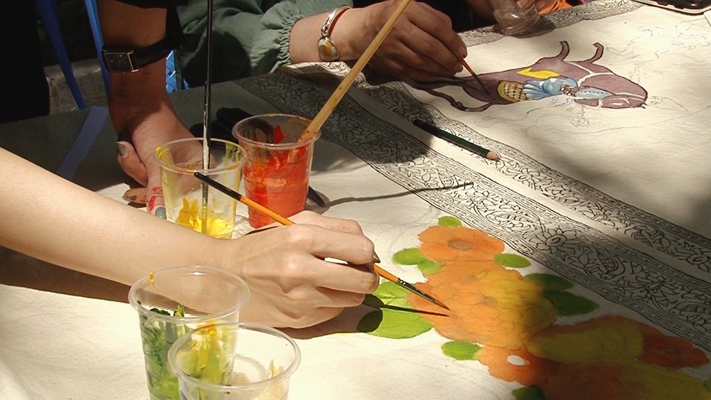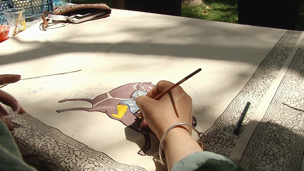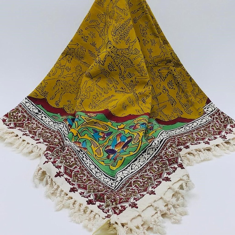Karakteristike slikarske olovke U ovom području rukotvorina, dizajni kao što su motivi životinja i prirode, minijature, cvijeće i biljke, islamski motivi, kaligrafija i vjerski dizajni primjenjuju se na tkaninu. Budući da pamučne tkanine imaju bolju sposobnost upijanja boje, manje se koriste od vunenih tkanina u kaligrafiji i slikanju. Boje koje se koriste u ovoj umjetnosti su biljnog, životinjskog ili mineralnog podrijetla. Kalupi koji se koriste u ovoj oblasti za dizajn na tkanini su od drveta oraha, kruške i gloga. Danas se Qalamkar tkanine uglavnom koriste kao stolnjaci, prekrivači, stolnjaci i tepisi.