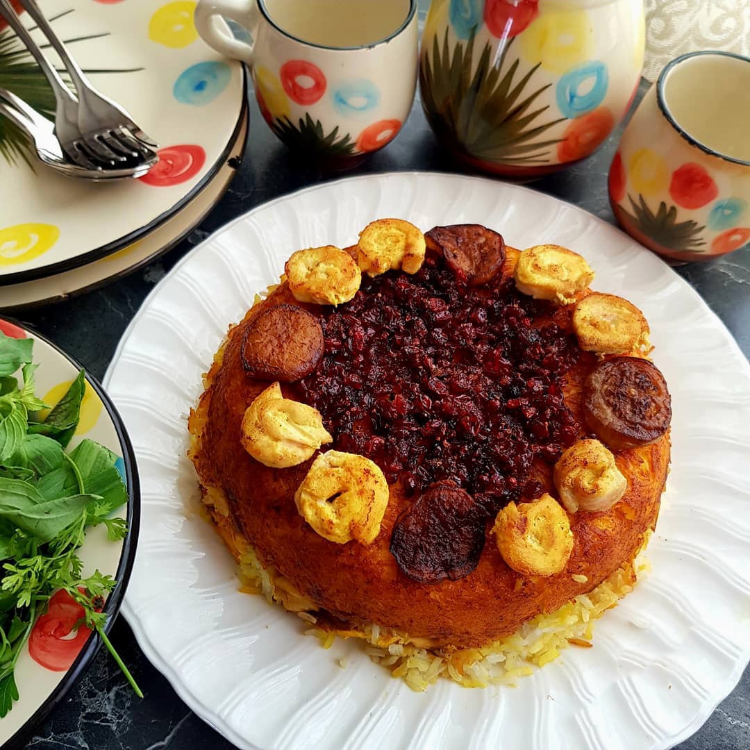 Nakon što se hrana dobro prodinsta, stavite je u veliku posudu i ukrasite žutikom, pirinčem od šafrana i kriškama pistaća i badema. Ovo jelo se obično servira uz popularnu Shirazi salatu. Napitak od ekstrakta cvijeta narandže pomiješanog sa vrbakom i ružom udvostručit će užitak hrane.