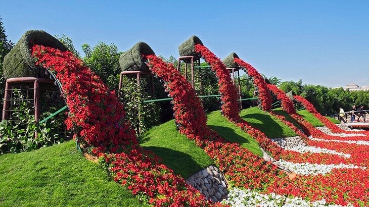 U različitim dijelovima bašte uzgajaju se iranske, japanske, francuske i italijanske biljke. Posjetioci imaju priliku vidjeti oko četiri hiljade biljnih vrsta iz raznih zemalja, među kojima je 300 vrsta grmova i 100 vrsta kaktusa. Većina sjemena koja se koristi u vrtu dolazi iz Holandije. Između ostalog, u sastavu vrta nalaze se: izložba kaktusa, nekoliko manjih jezera, travnati brežuljci, sezonsko cvijeće, akvarij, kameni vrt i engleski vrt. U različitim dijelovima bašte postavljene su sjenice za odmor i opuštanje posjetilaca. Sjedenje u mirnom prostoru sjenica i posmatranje raznobojnog cvijeća pruža ugodno i nezaboravno iskustvo.