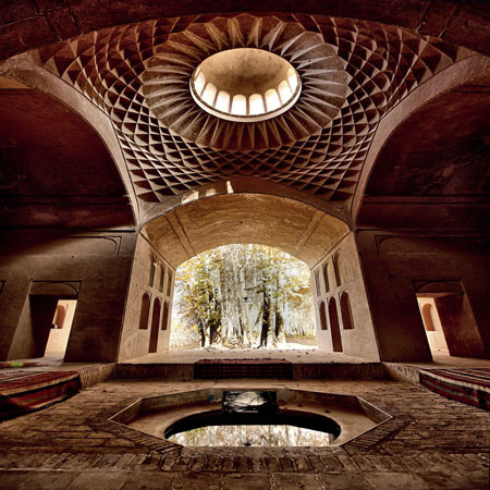 Arhitektura i prostori Bašče Pahlavanpur U Bašči Pahlavanpur iranska arhitektura savršeno se uklopila u prirodu. Voda potrebna za bašču dolazi iz kanata Hasanabad, jednog od iranskih objekata upisanih na listu svjetske baštine. Voda iz kanata direktno protiče baščom kroz kanal. Dio vode iz kanata Shah-Hosseini i Mezvirabad također dolazi u bašču. Ukupno 16 vodnih kvota pripada Bašči Pahlavanpur, a prema sistemu raspodjele vode kanata Mehriza, svakih 12 dana dolazi voda na 10 minuta. Sa obje strane glavnog kanala rastu drveće poput platana, nara, badema i kaki. Najljepši su visoki i snažni platani čije su grane isprepletene i stvaraju drvenu aleju.