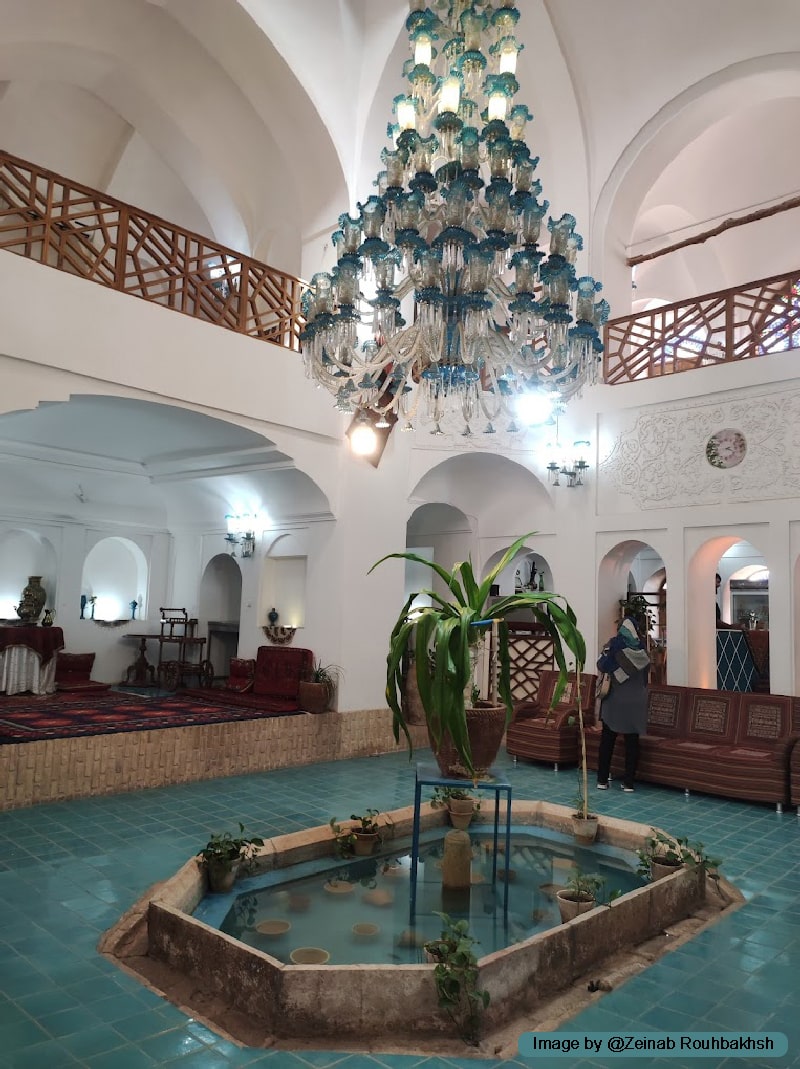 U kući se nalazi 86 soba tipa „sedmerovratnih“, „petovratnih“, „trovratnih“ i pomoćnih prostorija. Tu su i četiri dvorišta, brojni natkriveni i otvoreni hodnici, te tri ulazna hola koja povezuju dijelove kuće. Veličanstvena građevina svjedoči o visokom nivou vještine i preciznosti graditelja. Upotreba lokalnih pustinjskih materijala, prilagođenih klimi i geografskim uslovima Rafsandžana, doprinijela je njenoj dugovječnosti. Iako je u osnovi građena prema principima iranske arhitekture, u pojedinim dijelovima mogu se uočiti tragovi rimske, evropske i indijske arhitekture.